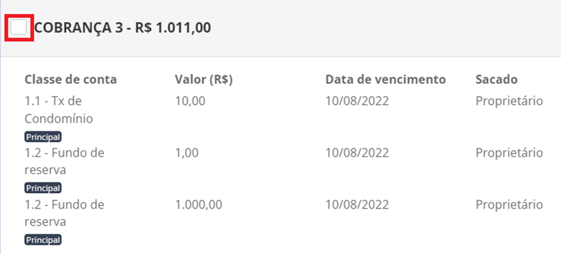 Posteriormente, deverá selecionar as cobranças a serem geradas por meio da caixa de seleção que consta em cada lançamento: